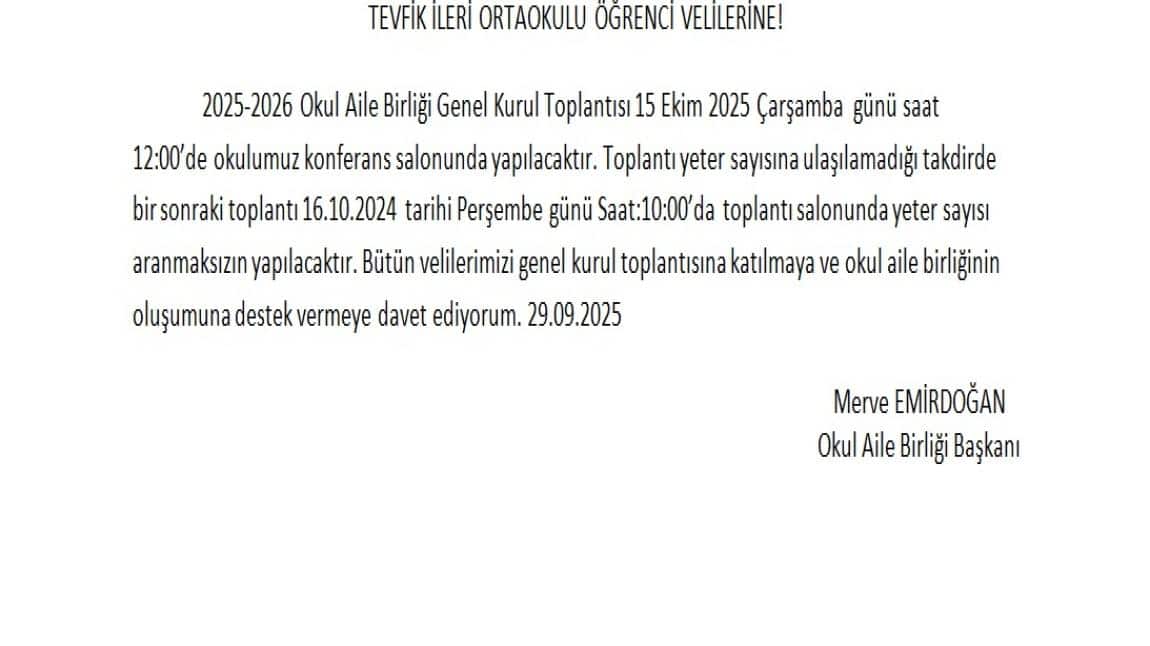 Okul Aile Birliği Genel Kurul Toplantısı Duyurusu